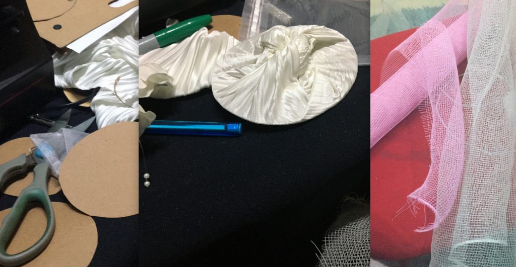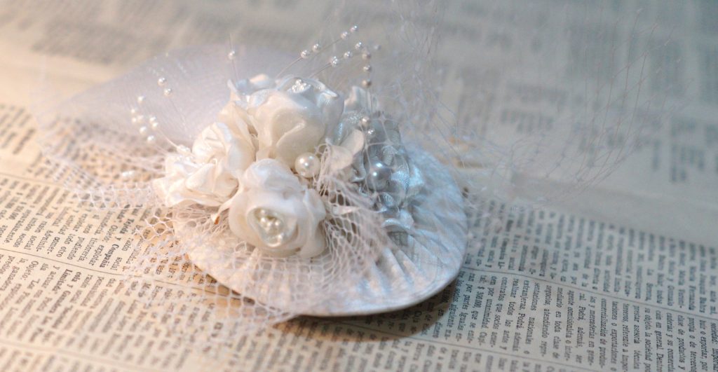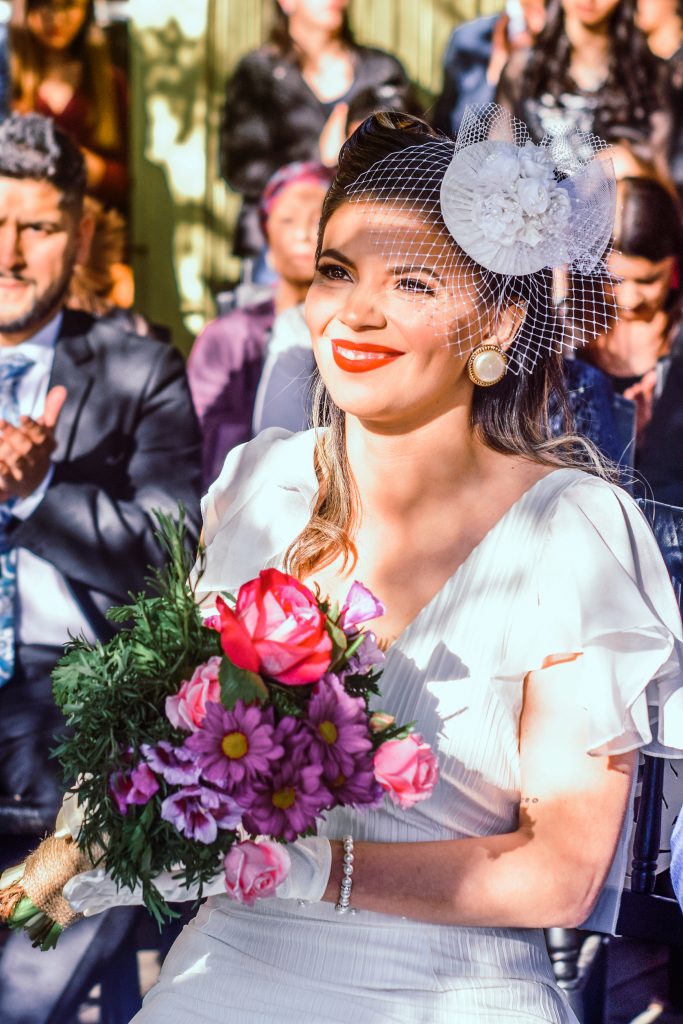 Un desafío personal de la novia fue el que asumí al tener el deseo de realizar mi propio tocado, cien por ciento a mano, inspirado no en cualquier modelo, sino que en la particularidad de los años 50s. Los materiales que utilicé fueron: cartón de una carpeta en desuso, tela en totalidad de vestido reciclado, perlas regaladas por mi abuela, malla que utilicé como aplicación conseguida en los puestos de flores del cementerio típico de la ciudad de Temuco y donación de la “Net Veil” por el diseñador Juan Daltónico. Posteriormente, la mano de obra fue de largos días de dedicación, ensayo y error, para lograr un resultado que me dejó plenamente feliz y contenta, con tranquilidad en el alma, y conforme por el valor agregado de lo especial del mí propio diseño.