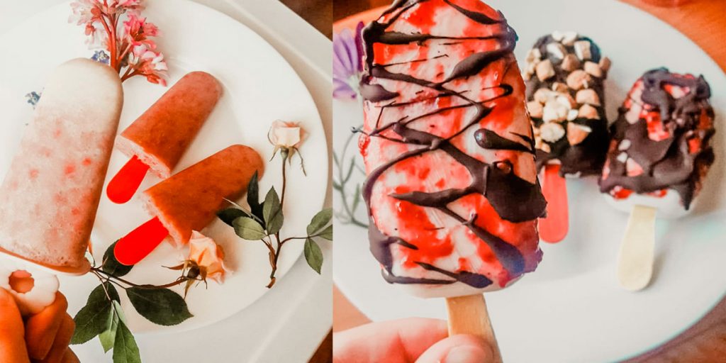Una vez listo, sacar y agregar mantequilla de maní o mermelada de frambuesa por cada lado y congelar por 40 minutos más. Este paso no es indispensable, pero te lo recomendamos, ¡queda increíble! A final, calientas el chocolate a baño María o en microondas y bañas rápidamente los helados sacados de los moldes previamente. Los dejas enfriar y ¡a disfrutar!