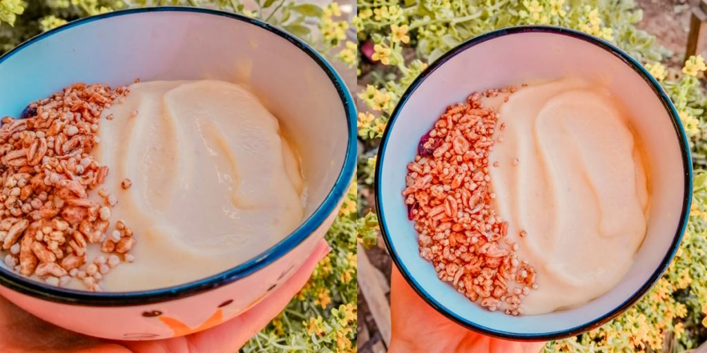 Manos a la obra o, más bien, a la licuadora o procesadora. Acá simplemente debes unir los ingredientes, excepto los toppings. Procesar/licuar hasta obtener una consistencia cremosa como de helado y ¡listo! Decora con lo que prefieras, este es el paso donde fluyes y juegas, le dejas tu sello, porque hay que dejar huella siempre jajaja.